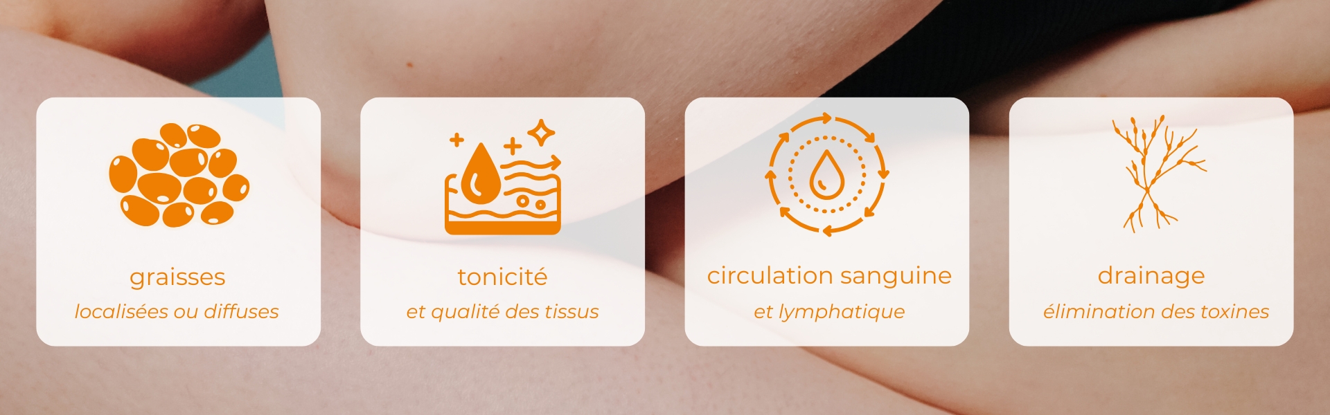 Son action thermique contrôlée permet de stimuler les tissus en profondeur, tout en respectant la physiologie cutanée. Elle agit efficacement sur :